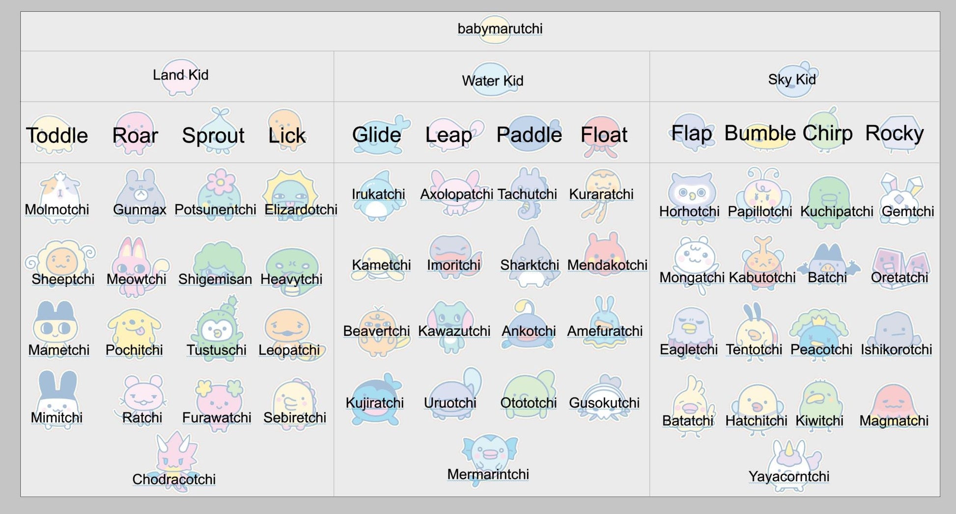 babymarutchi Land Kid Water Kid Sky Kid Toddle Roar Sprout Lick Glide Leap Paddle Float Flap Bumble Chirp Rocky Irukatchi Axolopatchi Tachutchi Kuraratchi Molmotchi Gunmax Potsunentchi Elizardotchi Horhotchi Papillotchi Kuchipatchi Gemtchi Kametchi Imoritchi Sheeptchi Meowtchi Shigemisan Heavytchi Sharktchi Mendakotchi Mongatchi Kabutotchi Batchi Oretatchi Beavertchi Kawazutchi Ankotchi Amefuratchi Mametchi Pochitchi Tustuschi Leopatchi Eagletchi Tentotchi Peacotchi Ishikorotchi Mimitchi Ratchi Furawatchi Sebiretchi Kujiratchi Uruotchi Otototchi Gusokutchi Batatchi Hatchitchi Kiwitchi Magmatchi Chodracotchi Mermarintchi Yayacorntchi